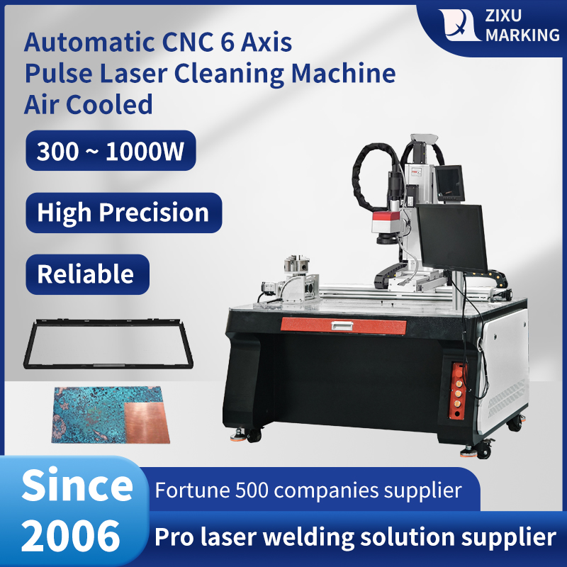 This automatic platform pulsed laser cleaning machine utilizes a CNC multi-axis motion control platform and a large-sized cabinet. This configuration is also commonly used in automated laser marking and laser welding machines. By using servo motor movement modules along the X, Y, and Z axes, the machine can automatically move the cleaning galvanometer based on the input 3D model of the workpiece, thus cleaning larger areas of rust more stably and efficiently than handheld operation. Furthermore, rotary axes (R-axis), tilting axes, etc., can be used to automatically and efficiently clean workpieces of specific shapes, avoiding substrate damage caused by over-cleaning that is common with handheld operation. This system offers flexible configuration options, ranging from 50W air-cooled 1.5mJ lasers to 1000W or even 2000W 150mJ water-cooled pulsed lasers. The key advantage lies in using multi-axis motion to replace manual labor, achieving more stable cleaning results, improving cleaning aesthetics and efficiency, and reducing substrate damage.0*400*400mm, enabling precise and automated tasks such as rust removal, paint removal, anodizing layer removal, and coating removal. A tilting galvanometer allows for tilted laser beam incidence relative to the workpiece, reducing the impact of surface unevenness or contaminants on cleaning uniformity and minimizing potential damage to the substrate from laser energy absorption. The tilting rotating fixture also enables automated, high-precision cleaning of various irregularly shaped workpieces.