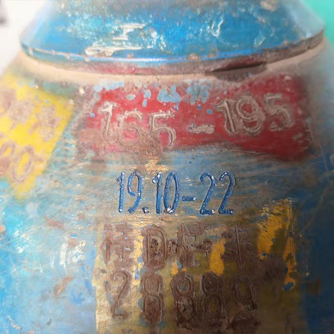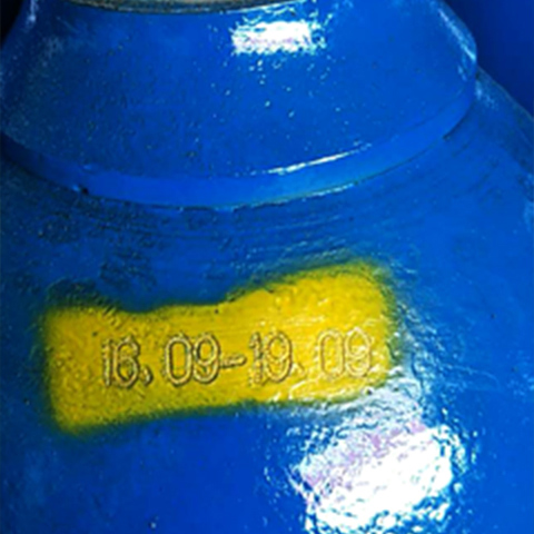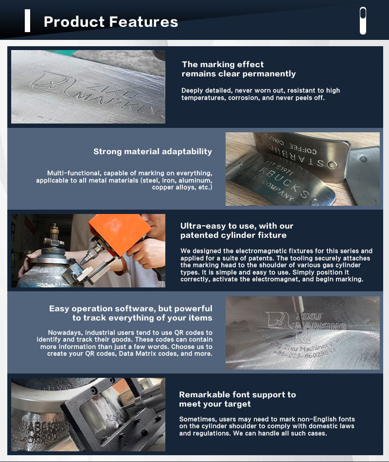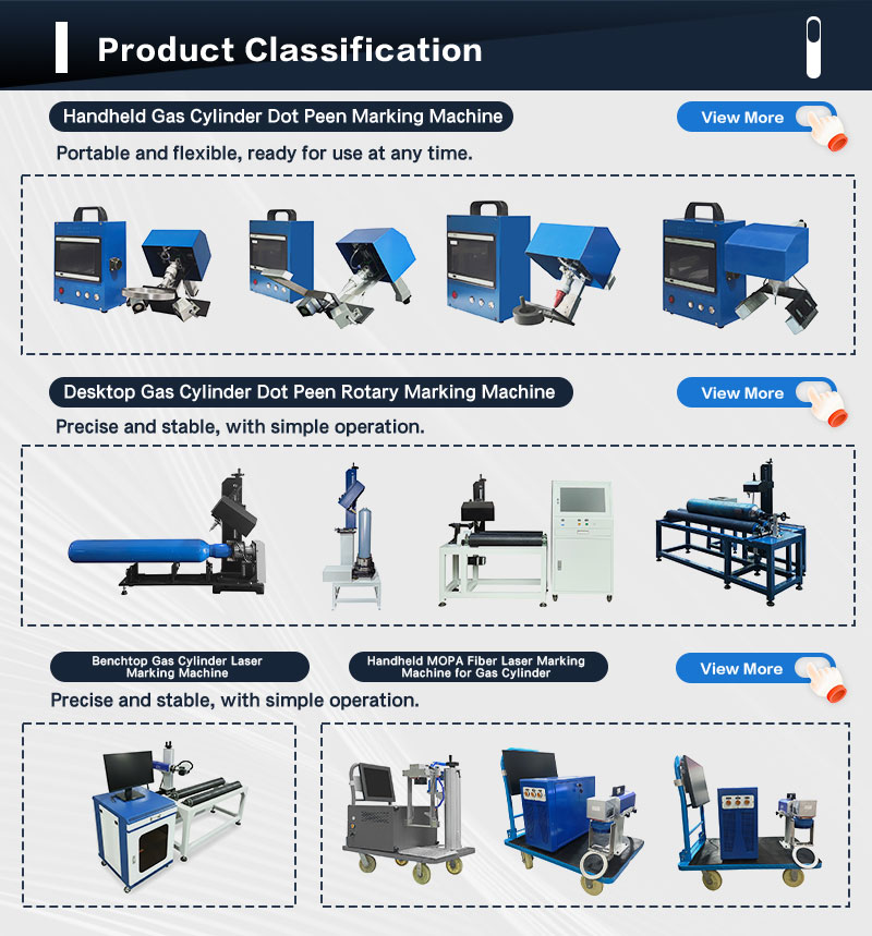 This vertical rotary dot matrix marking machine is suitable for shoulder marking of small to medium-sized gas cylinders with capacities of 5-50L, lengths of 40-650mm, diameters of 10-250mm, and weights of 0.1-50kg. This machine is favored by many medium-sized industrial gas suppliers. Its long-amplitude special marking needles ensure that the lettering and patterns are marked on curved surfaces without distortion. The single marking depth can reach 0.3-0.5mm. Whether marking is followed by painting or painting followed by marking, clear and permanent markings can be achieved, meeting the identification and traceability requirements of various national or industry standards. For manual loading and securing of these gas cylinders, the vertical marking machine is more labor-saving and faster than a horizontal system. Forklifts, overhead cranes, hydraulic power arms, and robotic arms can be used for cylinder loading. The machine is equipped with a wall-mounted Thorx-6 touchscreen controller, which is connected to the marking machine via an overhead cable. The controller can be installed separately, and the cable length can be customized.
