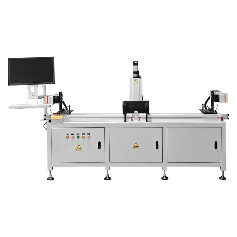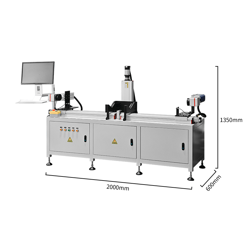 This fully automatic printing plate laser marking machine is mainly used in the printing plate-making industry. After plate making, the printing plate needs to be marked with the content information at both ends to quickly locate the correct printing plate during printing. This machine supports printing rollers with diameters of 100~400mm, lengths of 350~1700mm, and weights ≤50kg, covering commonly used ink-based high-volume printing roller specifications. The machine has a Z-axis travel, which can automatically raise the printing roller for symmetrical double-fan-shaped text and code marking. Because this type of printing roller marking requires a certain level of high-contrast visibility, we use a 50W Raycus MOPA laser, which can efficiently mark the printing roller with a dark gray color and sufficient depth, allowing customers to quickly find and match the markings.
